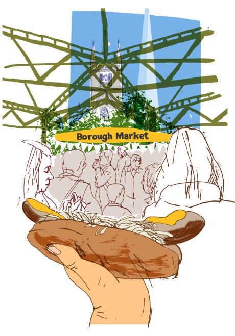 Down the steps by Southwark Cathedral, into the wonderful food smells and the human crush of Borough Market. Under the girders are the stalls, doing a brisk trade: Bermondsey Bangers with their beef, venison, and ‘Ultra Beef’ burgers; the oyster stall; a Middle Eastern stall heaped with aubergine and pumpkin kibeh, spinach parcels, halloumi cheese; a long trestle table piled with loaves of all kinds. There’s a huge stack of whirled meringues next to a cascade of those lovely Portuguese custard tarts – people are snapping away and buying food at the same time – it’s a total feast for the senses. This is not your average market – it’s a very designed market, with cool graphics on the walls and superstructure: visitors’ fulsome quotes, apparently – in their corporate typestyle. It’s been there since 1014 (AD that is), they reckon, though I imagine the branding was more homespun then.