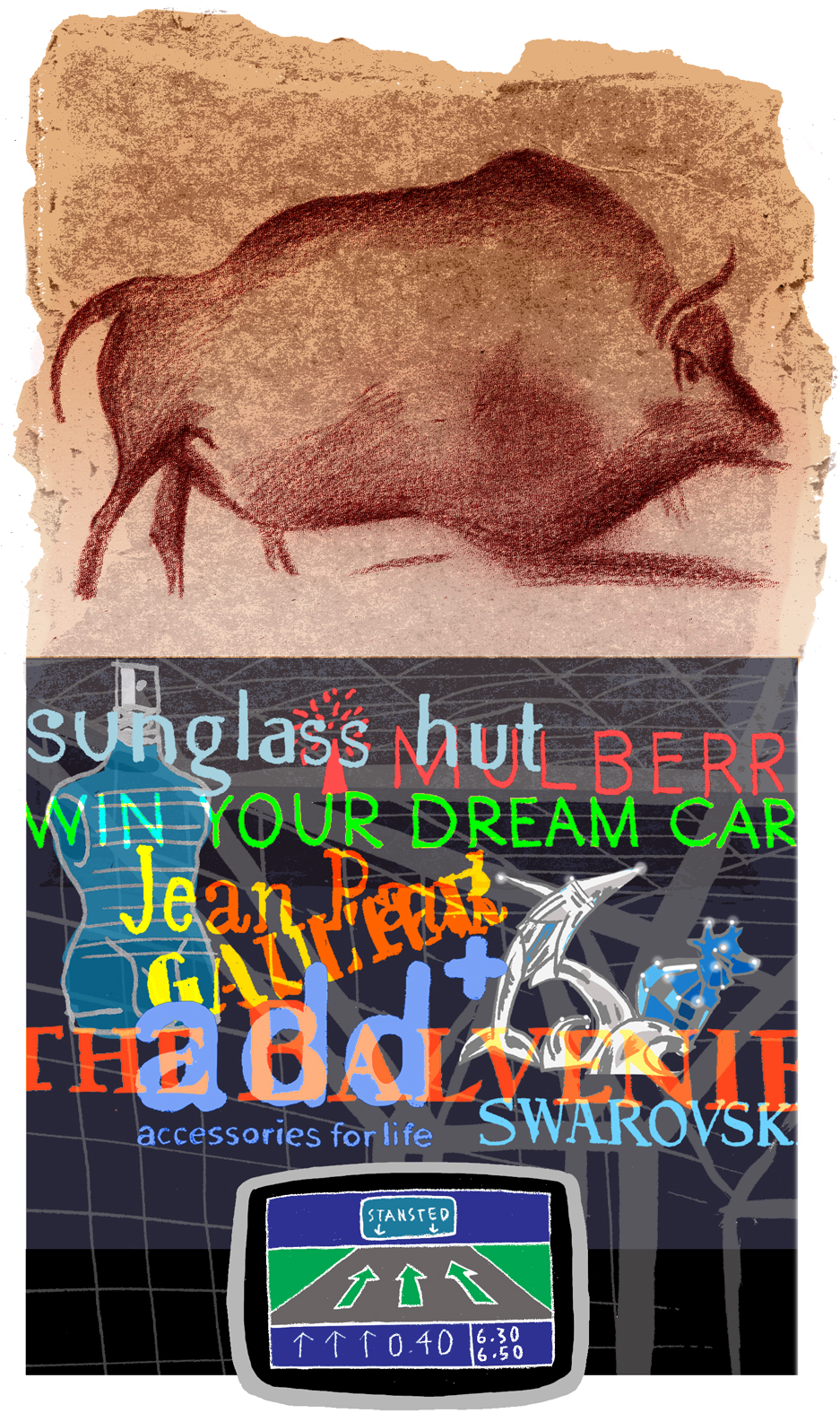 The American is dabbing the little wound on his bald head: he was warned about the low roof and the stalactites but immediately walked into one. The cave, though immaculate, still has that deep rich old smell, beyond time. Above us two reindeer are nose-to-nose, painted onto the rock shelf. The standing deer seems to be licking the other’s snout, standing over it, sympathetically, or triumphantly – who knows? A herd of bison stampedes around the walls at head height; the undulating surface of the walls would give body and movement to their forms, especially when lit from below by flame. 17,000 years ago artists were painting these living animals in manganese onto the wall, and they still live.